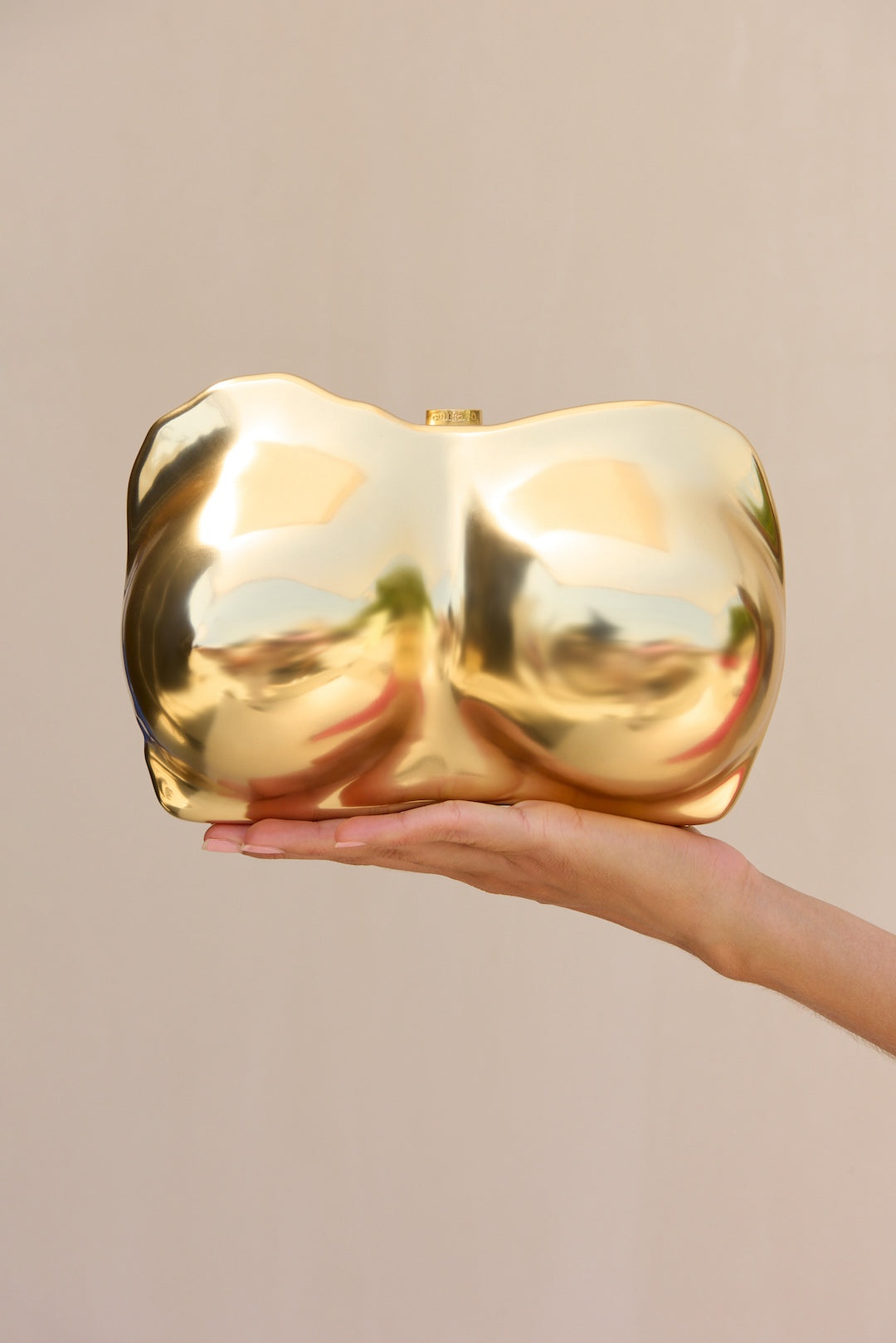 A shiny brass handheld clutch inspired by the female bust form with a top closure. — Shiny brass — Abstract female form — Top closure SIZE & FIT NOTES 4.3" W x 9" L x 6.7" H COMPOSITION AND CARE 100% BRASS