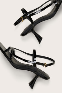 An open-toe sandal designed with a comma shaped heel and slim patent leather straps. — Comma shaped heel — Patent leather — Gold-toned, brushed-brass hardware — Square open-toe SIZE & FIT NOTES HEEL HEIGHT: 2.75" COMPOSITION AND CARE UPPER: 100% CALF LEATHER, SOLE: 100% RUBBER, HEEL: 100% ABS