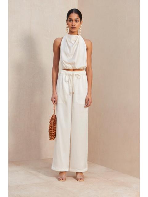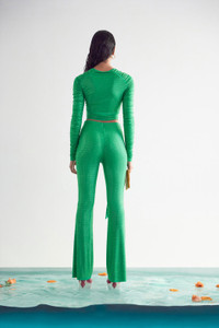 Shimmering with emerald-hued hotafix rhinestones, these high-waisted pants taper at the knee before flaring ever so slightly at the ankle for elegant movement. The elastic waist band and form-fitting glimmering fabric highlight the curves of the body just right. Designed in an unlined stretch jersey for easy wear, wear with the Pasilee Top for a full Gaia look. FIT NOTES Model is 5'9" and is wearing a size Small High waist Elastic at waistband Hotafix rhinestones Slight flare at bottom Style runs small, we recommend sizing up COMPOSTION AND CARE 82% Nylon, 18% Spandex