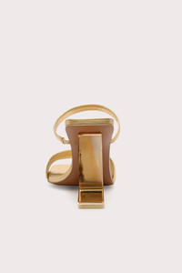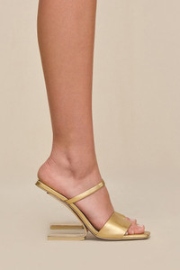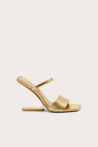 An architectural metallic leather sandal designed with a suspended brass heel, artfully playing with negative space. — Metal heel — Leather sole — Double straps — 4.3" heel height SIZE & FIT NOTES 110MM HEEL HEIGHT COMPOSITION AND CARE UPPER: 100% SHEEP LEATHER, OUTSOLE: 100% RECONSTITUTED LEATHER, HEEL: 100% IRON Gently wipe leather with a soft, dry or slightly damp cloth to remove dirt and dust. For deeper cleaning, use a leather-specific cleaner with a soft cloth. Do not use water or household cleaners.