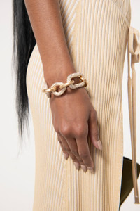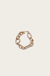 Designed in stunning, gold-tone brushed brass hardware, the Reyes Anklet is an eye-catching, sparkling piece created from an interlocking chain, alternating rhinestone encrusted links with gold-toned brushed brass links. A toggle closure allows this to be worn for a tighter or looser fit. Bonus, Reyes doubles as a bracelet. FIT NOTES Medium weight Lobster clasp closure COMPOSTION AND CARE 25" x 10.5" x1" Body: 100% Brass Trim: 100% Plastic