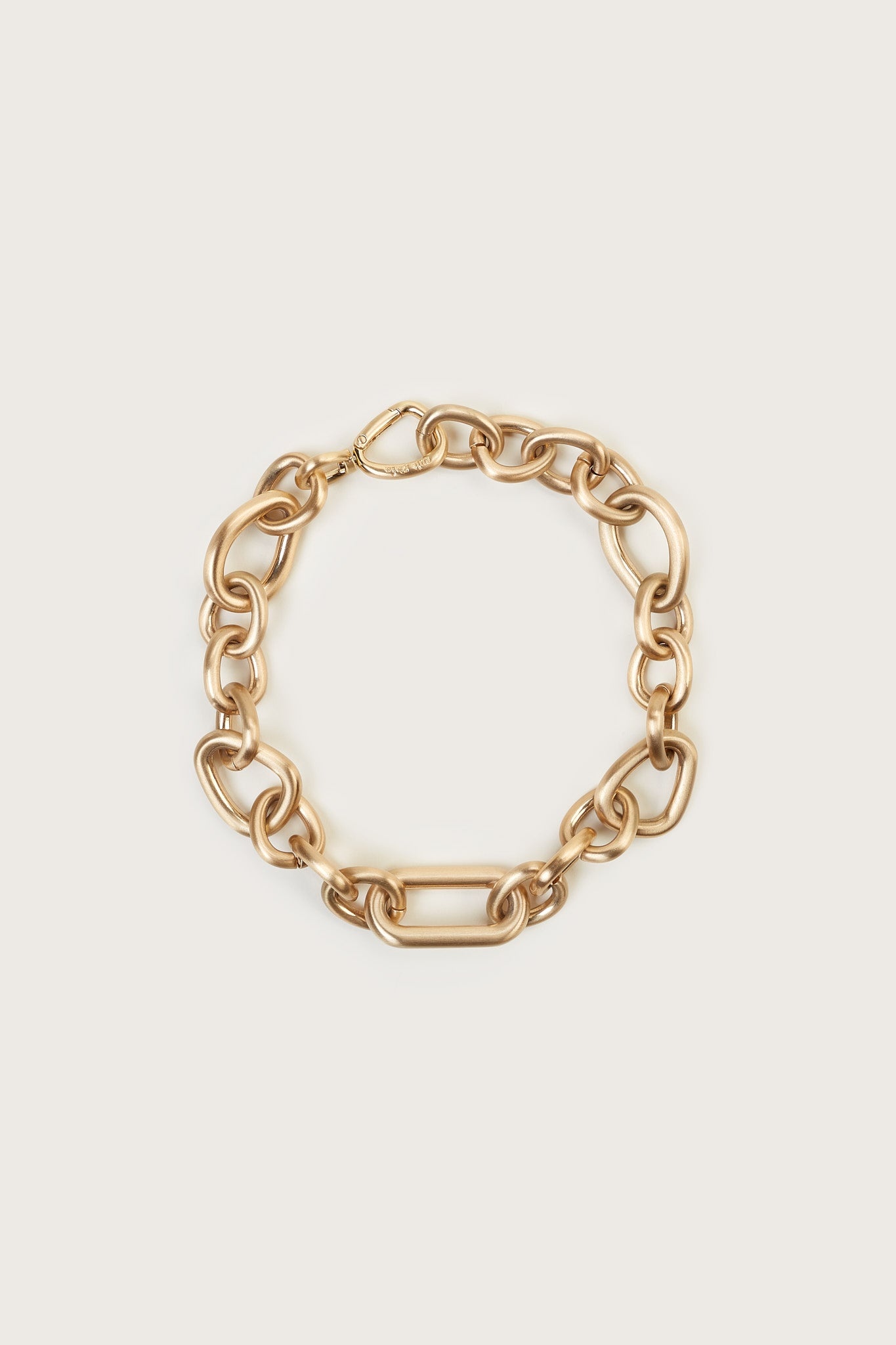 The Reyes Necklace needs no introduction. Rendered in stunning, gold-tone brushed brass hardware, this 20.5” long and 1” thick necklace is a show-stopping piece created from an interlocking brass chain. A lobster claw closure in the back allows easy adjustable to be worn for a tighter or looser fit. Pair with any outfit for a standout look. FIT NOTES Lobster clasp closure Medium weight COMPOSTION AND CARE 19.25" 100% Brass Comes with Cult Gaia box