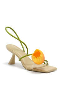 L.A.-based Jasmin Larian Hekmat, the brains behind the cult-favorite Ark bag, returns with more ultra-desirable accessories in her Cali-infused, bohemian style. The 'Ria' is a sculptural heeled sandal with a calla lily flower and stem-like straps that twist around the foot. PRODUCT DETAILS - Heel height measures 80mm/ 3" - Slip on - Composition: 100% Sheep leather, 100% TPU; Outsole: 100% Reconstituted leather; Heel: 100% ABS - Imported