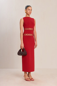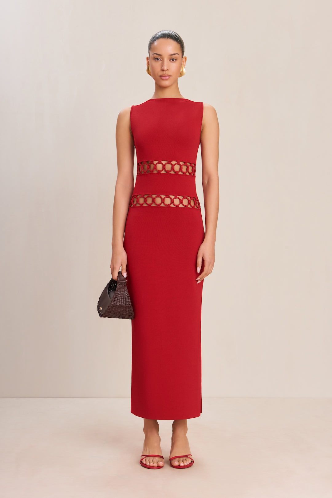A midi-length knit midi dress with central o-ring cutouts and a center back zipper. — Bateau neckline — Ankle length — Central cutouts — Back zipper — Runs large, we recommend sizing down SIZE & FIT NOTES Model is 5'10" and is wearing a size Small Runs large — We recommend sizing down COMPOSITION AND CARE 65% VISOSE 35% NYLON