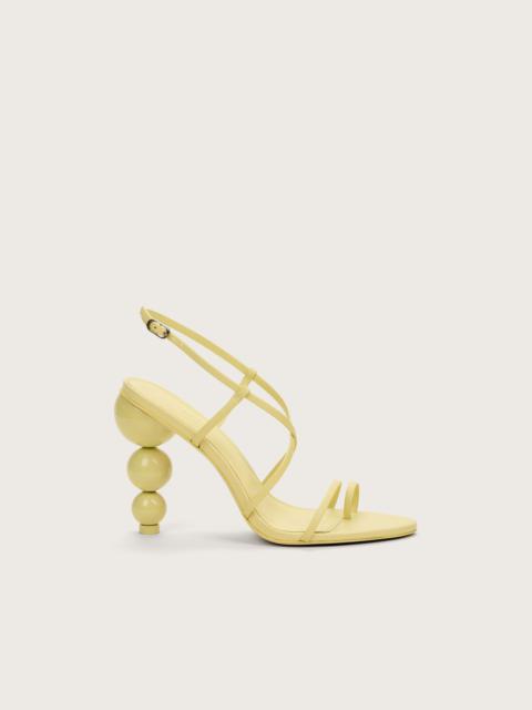 Robyn reinvents the classic heel silhouette with sculptural creativity. She towers upon an artistic heel composed of 3 balls that crescendo in size to create a slimming effect. Her slender leather straps and sole juxtapose the round heel and keep you secure. An adjustable ankle strap features a gold-toned, brushed brass buckle. Her vibrant Lemon Sorbet color will have all eyes on you. FIT NOTES Heel Height: 3.75" COMPOSTION AND CARE Upper: 100% Cow Leather Outsole: 100% Rubber Heel: 100% ABS