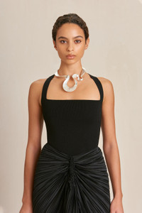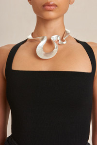 Preorder - Estimated Ship Date Between November 25th and December 9th A slim, ribbon-like choker designed from antique silver-tone brass wraps around the neck. — Objet d'art — Antique finished brass — Open collar silhouette SIZE & FIT NOTES 1" W x 8" H x 6" L COMPOSITION AND CARE 100% BRASS