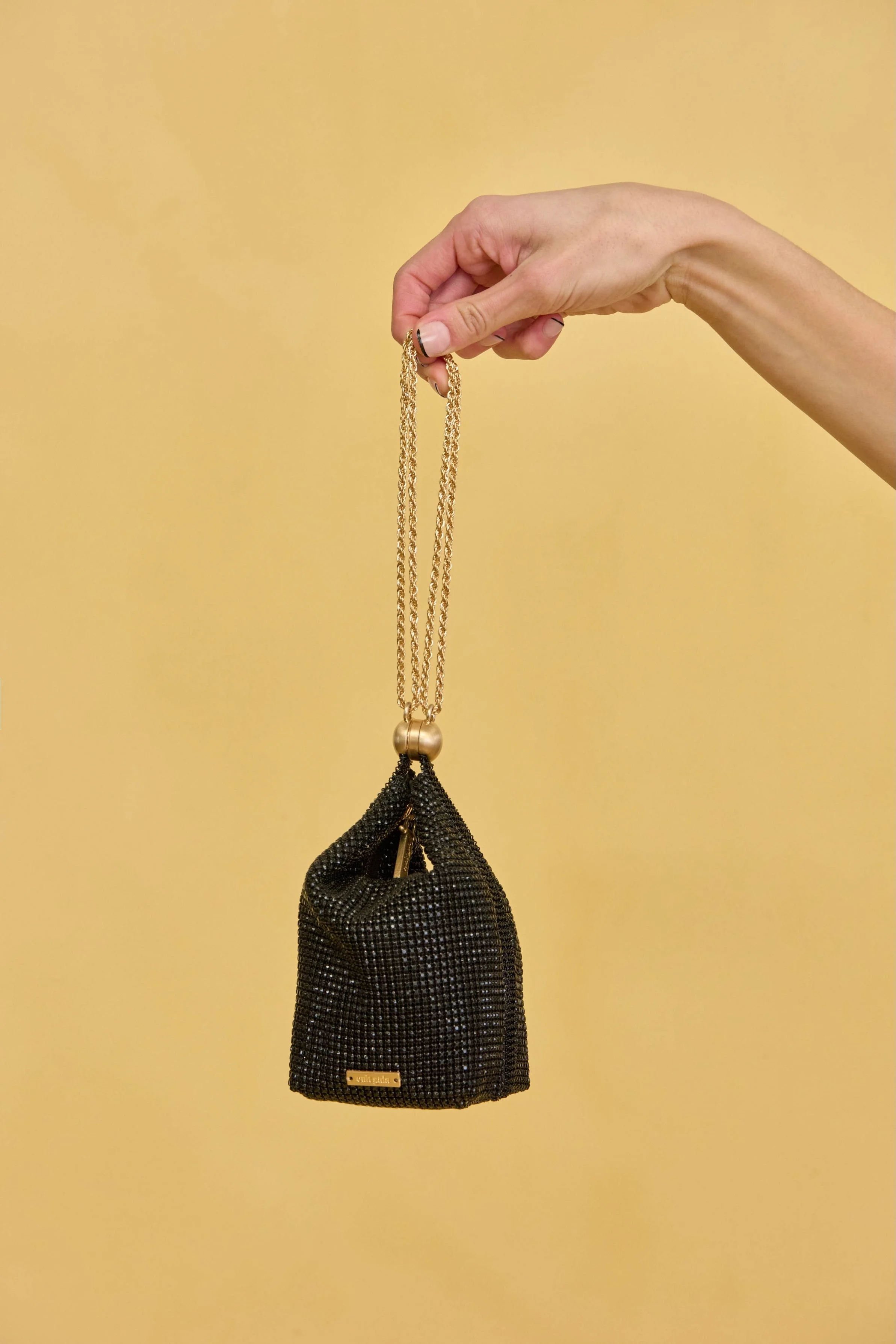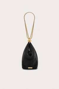 Rue is an elegant wristlet bag rendered in gold-toned trim and shimmering black glass beads. — Twisted gold-toned chain strap — Zipper and snap closure — Glass beads SIZE & FIT NOTES Can fit a phone when anchor magnet is open. 0.70" W x 6.10" H x 6.90" L COMPOSITION AND CARE BODY: 100% GLASS LINING: 90% POLYESTER 10% VEGAN LEATHER
