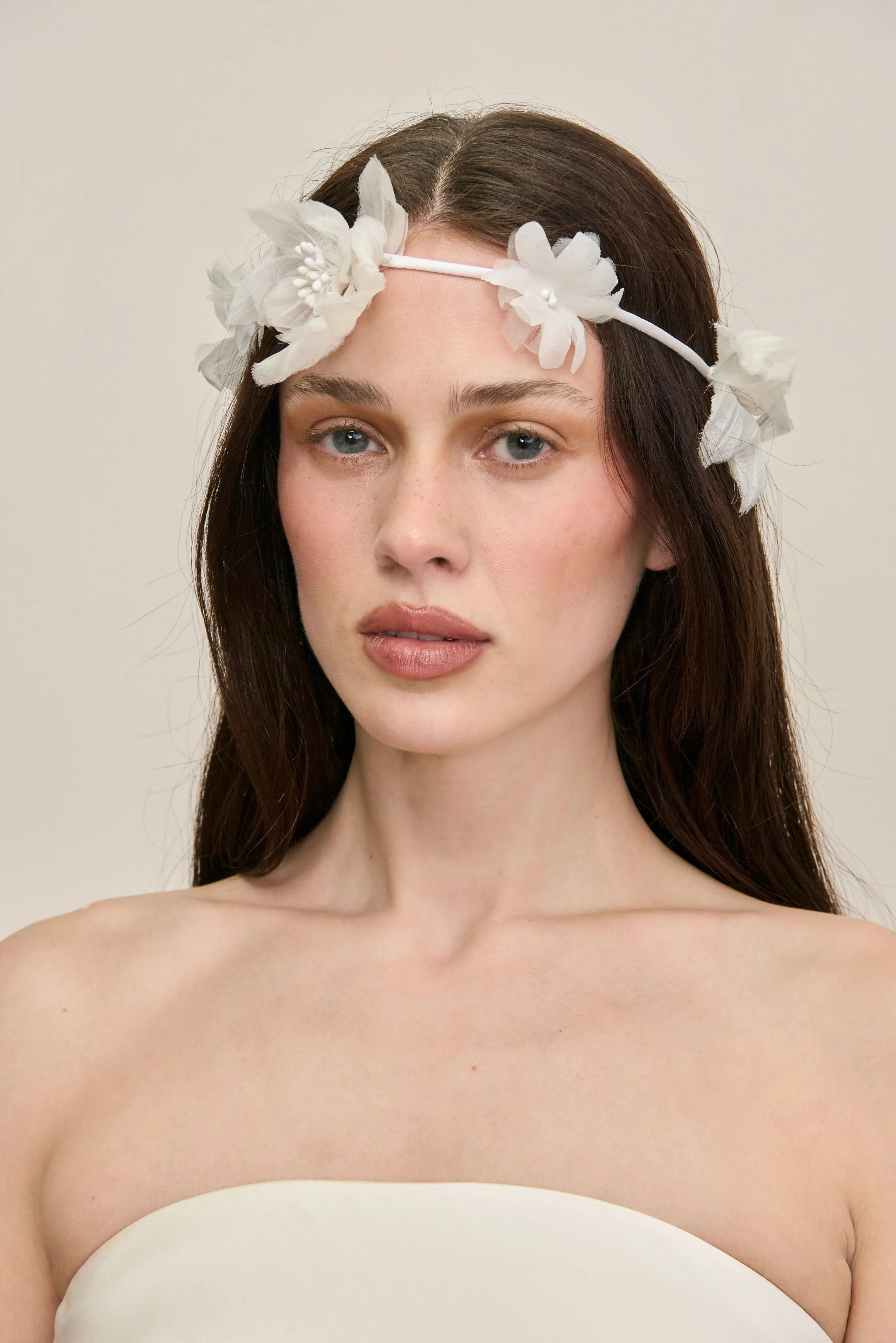 A delicate crown adorned with intricate flowers made of silk. — Flower crown — Adjustable cord — Silk flower detailing — Silk cording COMPOSITION AND CARE 100% SILK