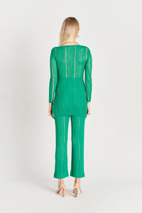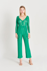 Designed in a sheer ribbed knit, Savannah is the most comfortable pant you’ll ever wear. Her ultra-high rise fit and modernized, slightly flared leg has stretch that flatters and hugs your curves beautifully. This design is so easy to throw on, wear with the Laila Knit Top for a full monochromatic look. FIT NOTES Model is 5'11" and is wearing a size Small Length: 27 1/2" Front rise: 12" Elastic at waist Slightly transparent Ribbed cuff at leg opening Pull-on style COMPOSTION AND CARE 92% Viscose, 8% Nylon