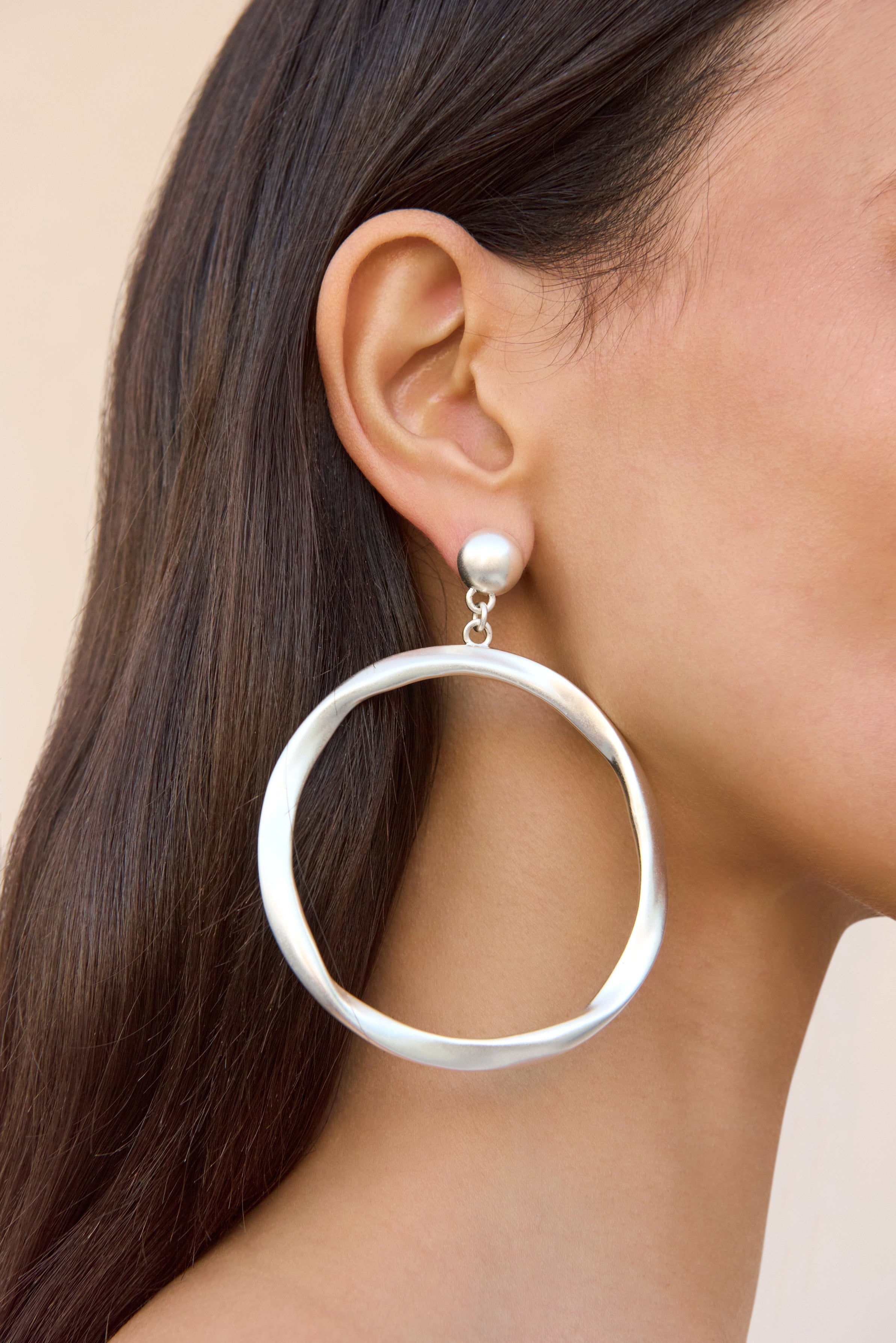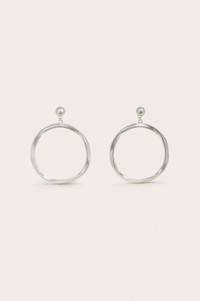 A stunning hoop earring that glimmers in our antique silver finish. — Signature oblong shape — Post backing — Antique silver finish SIZE & FIT NOTES 0.22" W x 3.10" H x 2.72" L COMPOSITION AND CARE 100% BRASS