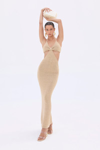 The Serita is a cutout woven knit maxi dress. Thoughtful cutouts shape your figure, highlighting the small of your waist. A bra silhouette with a bare all open back. Pair with the Banu Bag and bare feet and you're ready for a night of dancing on the beach. For larger busts, we recommend sizing up. This style tends to run small. SIZE & FIT NOTES Adjustable halter neck Cutouts at sides Double-layered top Center front twist Stretches when on hanger, fold only For largest busts, we recommend sizing up. This style tends to run small COMPOSITION AND CARE Length: 58 3/4" 77% Cotton, 23% Polyester Model is 5'10" and wearing size Small