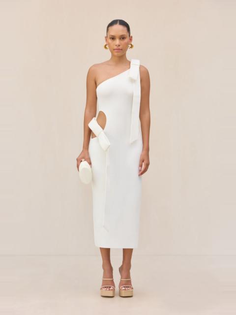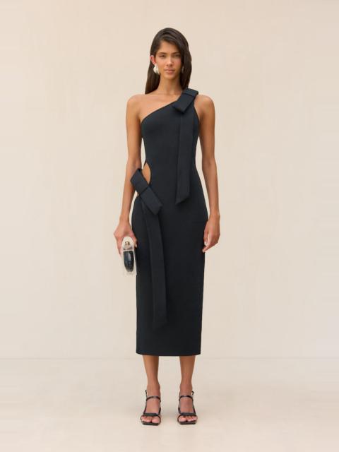 A long sleeve knit midi dress with a woven neck strap that connects to a pearl adorned bow detail that accentuates an open back. — Midi length — Long sleeve — Pearl adorned neck strap — Open back with bow details FIT NOTES Model is 5'10" and is wearing a size Small COMPOSTION AND CARE 60% VISCOSE 40% NYLON