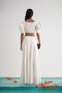 Hand embroidered sequins and glass-beads adorn the Sinai. This puffy sleeved cropped length top has it all. The voluminous shoulders lead to dramatic sleeves that are balanced by the crop top cut. This lined top has a central back zipper for easy wear. Modern elegance is found in this set, wear with the Pelli Skirt to complete the look. FIT NOTES Cropped Puff sleeve Center back zipper Lined COMPOSTION AND CARE 52% Polyester, 20% Acetate, 19% Cotton, 9% Metallic Yarn
