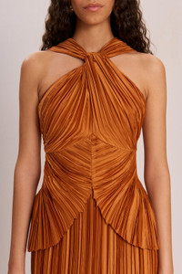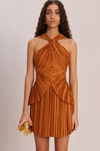 A gathered plisse mini dress with a cinched waist and twist halter neck. — Mini length — Plisse fabric — Gathered details at bust and waist — Center back zip SIZE & FIT NOTES Model is 5'10" and is wearing a size 4 COMPOSITION AND CARE 100% POLYESTER