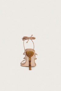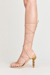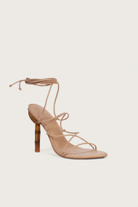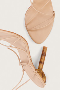 The Soleil Heel, the naked shoe. Features a lace up front with a bamboo effect high heel. This heel is open toe with delicate ties that can be tied around the ankle or to mid-calf. FIT NOTES Lace-up style Bamboo heel Padding at sole Italian Sizing Take a half size larger than normal COMPOSTION AND CARE Heel height: 4" Upper: 100% Leather Heel: 100% Bamboo