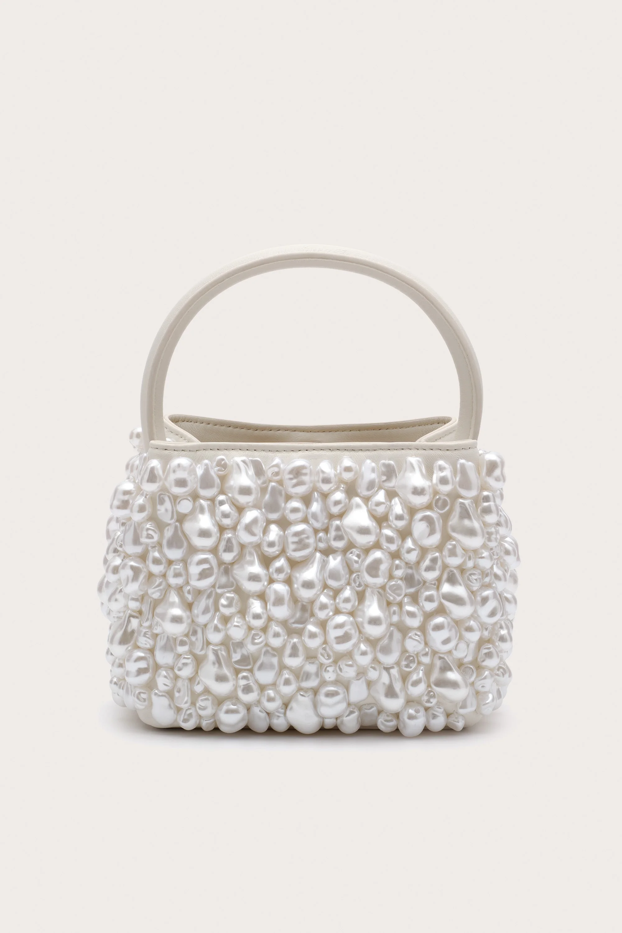 A mini bag crafted from leather and all over faux pearls with a top handle. — Leather body — All over faux pearls — Top handle — Cannot fit an iPhone SIZE & FIT NOTES 2.56" W x 4.72" H x 5.51" L COMPOSITION AND CARE 100% SHEEP LEATHER; 100% ABS PEARL; LINING: 51% RECYCLED POLYESTER, 49% POLYESTER
