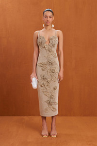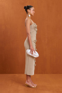 A shimmer knit midi dress with crochet flower applique details and a plunge neckline. — Midi length — Crochet flower applique — Plunge neckline — Adjustable, removable straps SIZE & FIT NOTES Model is 5'10" and is wearing a size Small COMPOSITION AND CARE 60% VISCOSE 40% POLYETHYLENE TEREPHTHALATE
