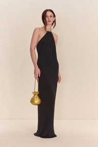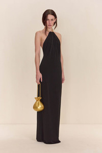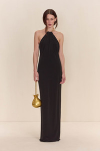 An elegant gown designed in matte jersey with a low back and a gold chain halter neck. — Floor length — Matte viscose jersey — Halter neck with gold chain detail — Figure hugging fabric — Low back