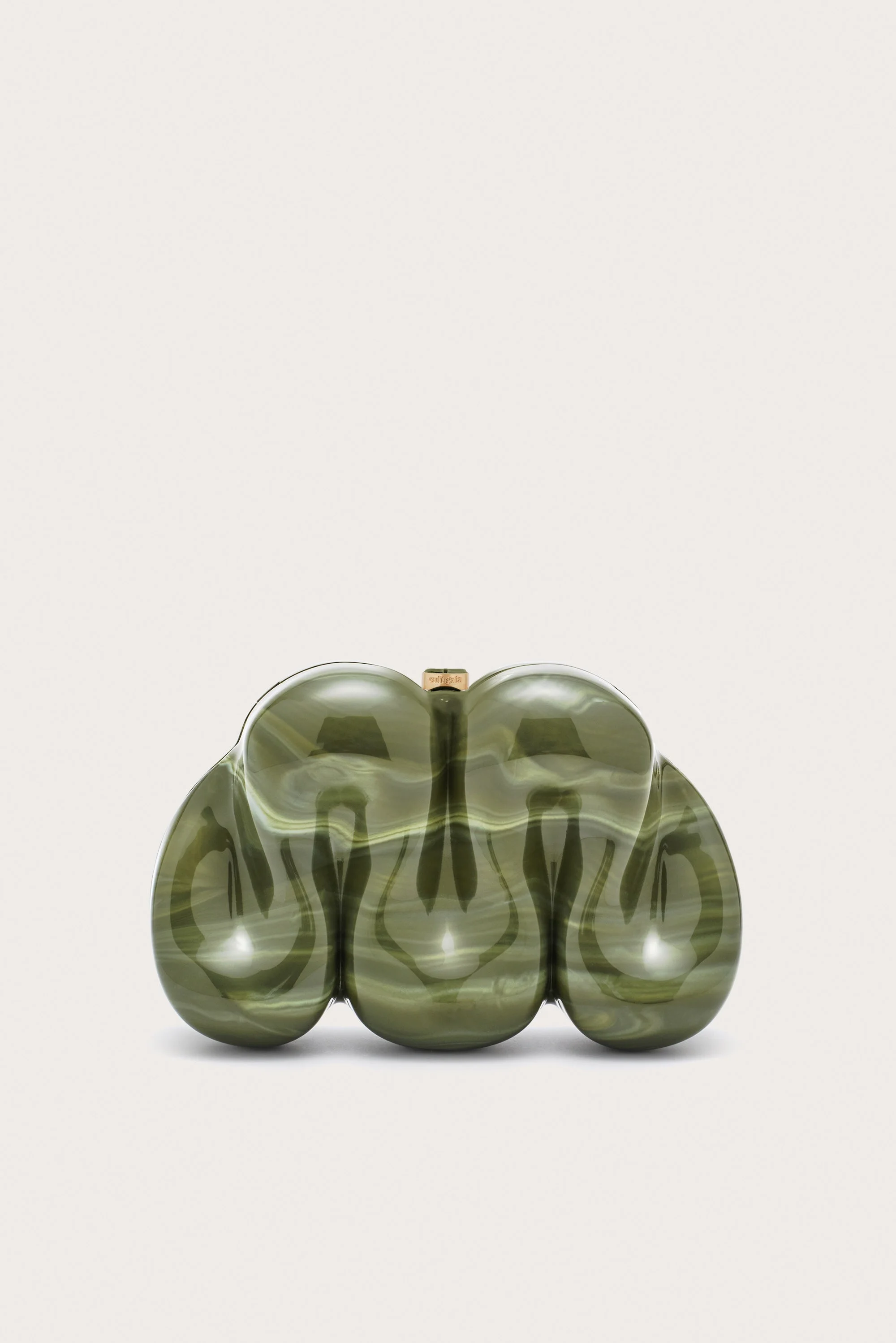 A playful acrylic clutch resembling a sculptural squiggle with a removable chain strap. — Marbled acrylic — Removable strap — Gold toned hardware — Concealable strap ears — Can fit an iPhone SIZE & FIT NOTES 3" W x .51" H x 8.46" L COMPOSITION AND CARE 100% ACRYLIC; HW: 100% ZINC ALLOY Wipe acrylic gently with a dry microfiber cloth, using plain water or mild soap for deeper cleaning. Dry immediately and avoid harsh cleaners or abrasives. Handle with care.