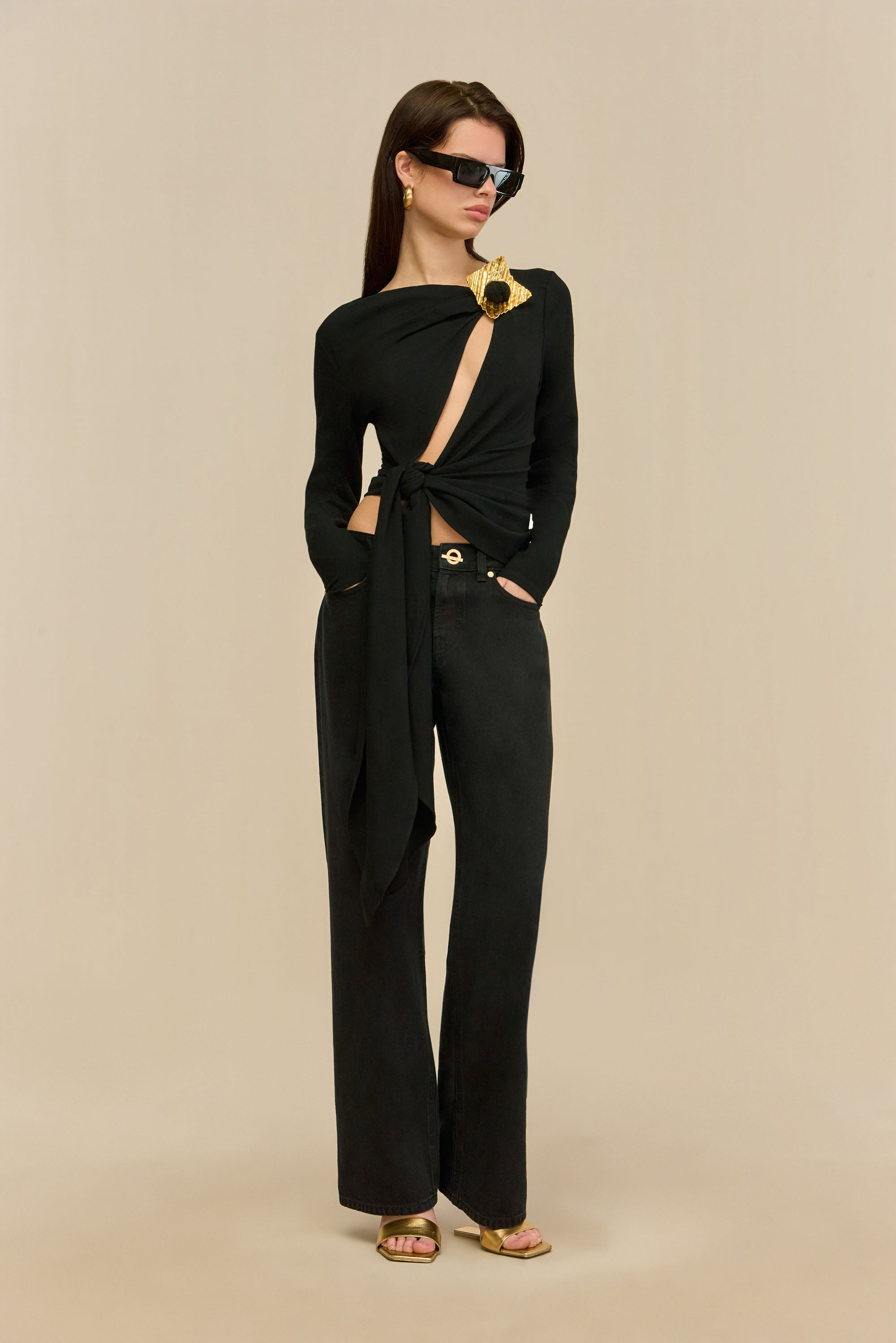 A wool jersey wrap top adorned with a pleated metal detail and an adjustable cutout down the center. — Pull on style — Adjustable tie — Can be wrapped and tied in front or back — Slim fit SIZE & FIT NOTES Model is 5'10" and wearing a size Small COMPOSITION AND CARE 56% VISCOSE, 38% VIRGIN WOOL, 6% ELASTANE HAND WASH COLD SEPARATELY, DO NOT SOAK TRIM, KEEP TRIM DRY, DO NOT BLEACH, DO NOT WRING OR TWIST, LAY FLAT TO DRY, COOL IRON IF NEEDED, DO NOT DRY CLEAN