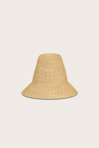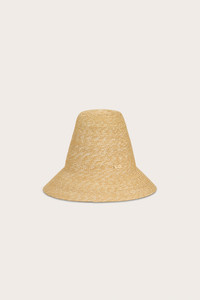 A bucket hat crafted in braided straw with an exaggerated crown and logo hardware. — Bucket hat silhouette — Cult Gaia logo hardware in front — Natural braided straw — Exaggerated crown COMPOSITION AND CARE 100% STRAW