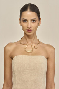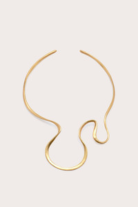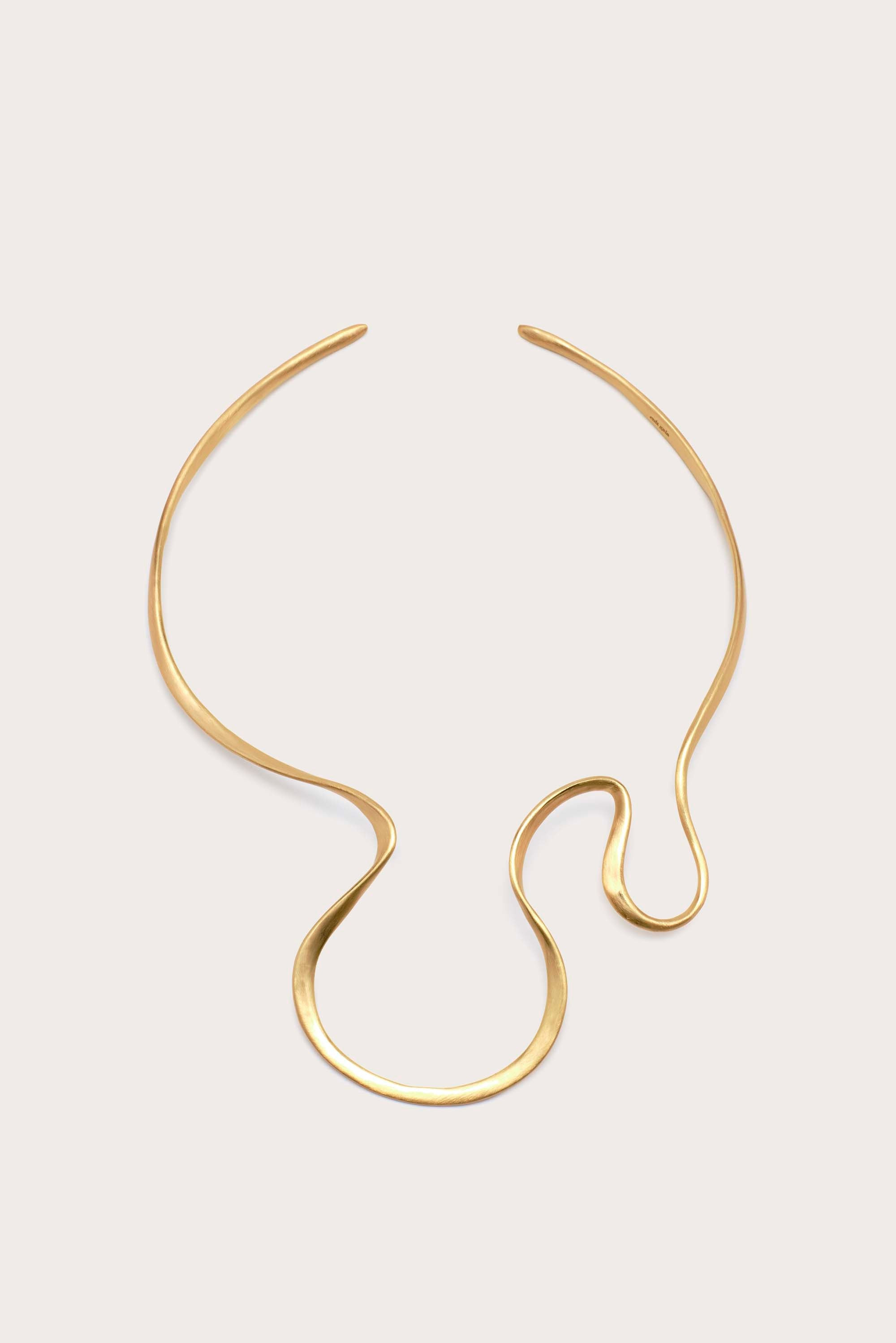 A slim, ribbon-like choker designed from brushed brass that wraps around the neck. — Objet d'art — Brushed brass — Open collar silhouette — Wraps around neck SIZE & FIT NOTES .16" W x 7.64" H x 5.12" L COMPOSITION AND CARE 100% BRASS Spot clean with microfiber cloth. Avoid contact with liquids to prevent tarnishing.