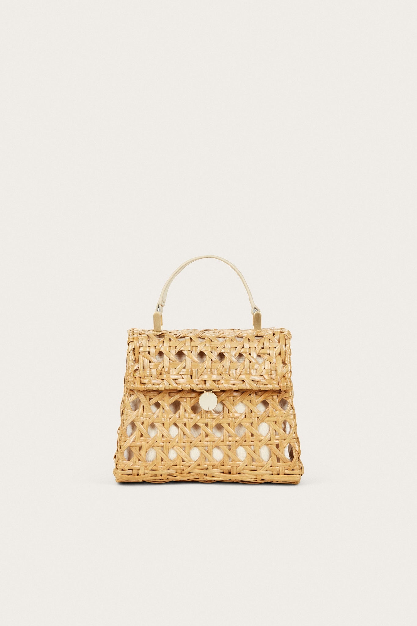 Crafted from wicker and smooth leather and lined in micro suede, a detachable smooth leather crossbody strap attached allows you to customize this as a clutch. Metal hardware at the closure and that connect the leather strap to the bag give a subtle glamour to this natural masterpiece. Feet on the bottom allows it to stand on its own. A magnetic snap closure keeps all of the essentials safe. SIZE & FIT NOTES Width: 3.5" Height: 5.9" Length: 7.9" Handle Drop: 3" COMPOSITION AND CARE Body: 100% Rattan Pouch: 100% Cow Leather