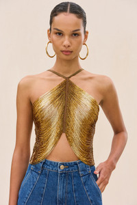 An ombre beaded draped fringe top featuring a halter neckline and deep open back. — Layered fringe — Halter neckline — Open back — Hook and eye closure SIZE & FIT NOTES Model is 5'10" and is wearing a size 4 COMPOSITION AND CARE 100% POLYESTER