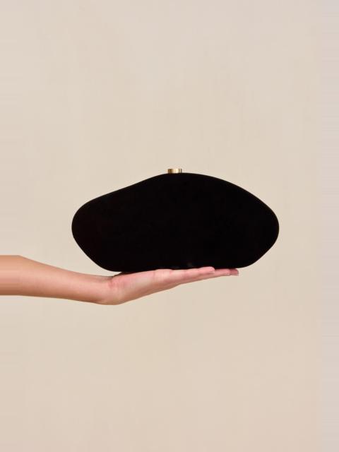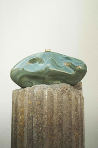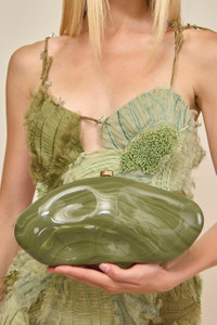 A sculptural clutch made of marbled green acrylic with a flat bottom and gold clasp at the top. — Gold hardware clasp — Flat bottom — Sculptural dents — Acrylic — Can fit an iPhone SIZE & FIT NOTES 3.31" W x 5.12" H x 11" L COMPOSITION AND CARE 100% ACRYLIC; LINING: 51% RECYCLED POLYESTER, 49% POLYESTER Wipe acrylic gently with a dry microfiber cloth, using plain water or mild soap for deeper cleaning. Dry immediately and avoid harsh cleaners or abrasives. Handle with care.