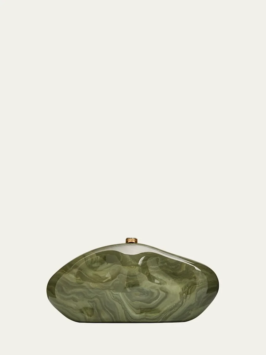 Cult Gaia "The Caldera" clutch bag in marbled acrylic with sculptural rises and dips across the surface Framed top with golden clasp closure Lining: Recycled polyester/polyester Approx. 5.1"H x 11"W x 3.3"D Spot clean Imported Online Inquiries: BGS21_V6R4B| Store Inquiries: #5364182