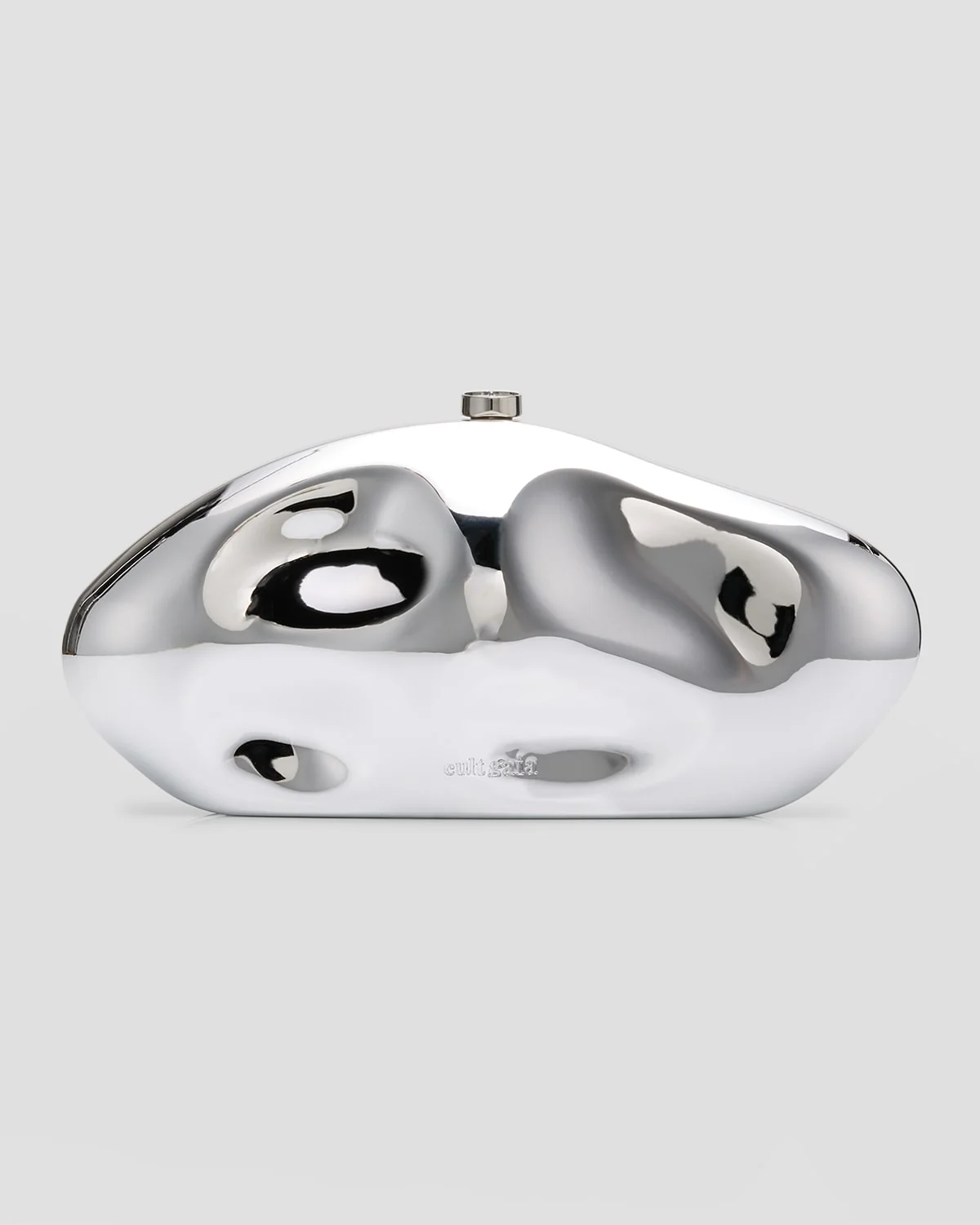 - Cult Gaia "The Caldera" clutch bag in metallic ABS and metal alloy - Framed top with lift-clasp closure - Approx. 5.4"H x 11"W x 3.3"D - Imported