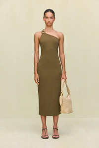 An asymmetrical knit dress with an open back and abstract gold-toned buckle details. — Ankle length — Abstract gold-toned buckles at shoulder and back — Figure hugging knit material — Open back COMPOSITION AND CARE 53% Rayon 46%NYLON 1%Spandex