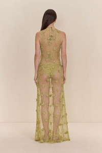 Preorder - Estimated Ship Date is Between June 2nd and June 16th A floor-length knit dress that doubles as a coverup, adorned with intricate crochet flowers throughout. — Sheer — Gold knit yarn — Acts as a coverup — Crochet flower details SIZE & FIT NOTES Model is 5'10" and wearing a size S COMPOSITION AND CARE 60% VISCOSE 40% POLYETHYLENE TEREPHTHALATE