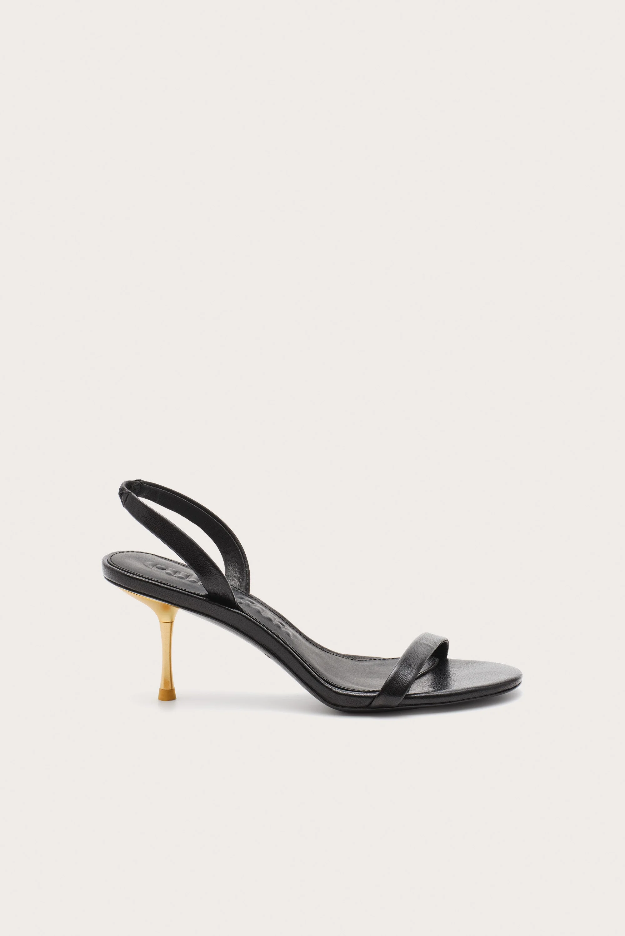 A heeled sandal featuring two leather straps and a golden heel. — Smooth leather — Gold heel — Two upper straps — 2.75" heel height SIZE & FIT NOTES 70MM HEEL HEIGHT COMPOSITION AND CARE UPPER: 100% SHEEP LEATHER, OUTSOLE: 100% LEATHER, TOP HEEL: 100% ABS, HEEL: 100% STEEL Gently wipe leather with a soft dry or slightly damp cloth to remove dirt and dust. For deeper cleaning, use a leather-specific cleaner — avoid water or household cleaners.