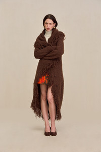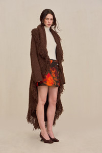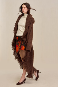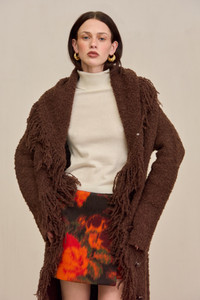 A cascading wool alpaca blend duster cardigan with a fringed hem and front button closure. — Wool alpaca blend — Button front closure — Stretch knit — Fringe hem SIZE & FIT NOTES Model is 5'10" and wearing a size Small COMPOSITION AND CARE 39% RWS WOOL, 22% ALPACA, 25% ACRYLIC, 13% RECYCLED NYLON, 1% SPANDEX