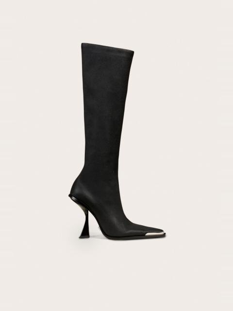 An over-the-knee leather boot with a comma heel and interior leg zip. — Over-the-knee design — Smooth leather — Comma heel — 2.95" heel height SIZE & FIT NOTES 75MM HEEL HEIGHT COMPOSITION AND CARE UPPER: 100% COW LEATHER OUTSOLE: 100% LEATHER HEEL: 100% ABS