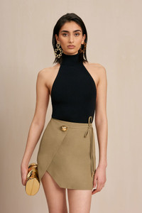 A high-neck, fully open-back halter top with wide back strap and narrow mock neckline. — Fold over mock neck — Open back — Elastic back strap — Lightweight knit SIZE & FIT NOTES Model is 5'10" and is wearing a size Small COMPOSITION AND CARE 60% VISCOSE 40% NYLON
