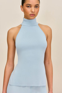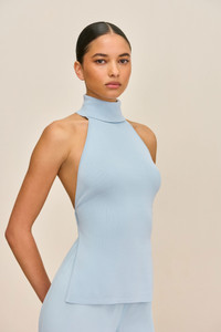 A high-neck, fully open-back halter top with wide back strap and narrow mock neckline. — Fold over mock neck — Open back — Elastic back strap — Lightweight knit SIZE & FIT NOTES Model is 5'10" and wearing a size S COMPOSITION AND CARE 65% VISCOSE 35% NYLON