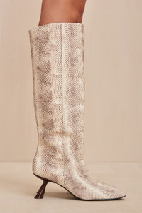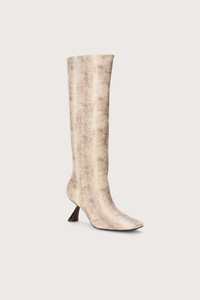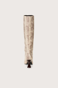Knee-high boot in stamped, multi-toned leather with pointed toe and comma-heel. — Stamped faux snakeskin leather — Knee high — Comma-heel — Rubber sole SIZE & FIT NOTES Heel Height: 2.75" COMPOSITION AND CARE Upper: 100% Cow Leather Sole: 100% Rubber Heel: 100% ABS