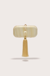 A marbled acrylic clutch adorned with a striking tassel detail. — Clutch silhouette — Marbled acrylic — Closure at top — Tassel detail SIZE & FIT NOTES 2.36" W x 3.94" H x 8.86" L COMPOSITION AND CARE 100% ACRYLIC; TRIM:100% POLYESTER; LINING:100% POLYESTER; FRAME: 100% IRON; HW: 100% ZINC ALLOY