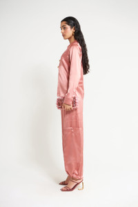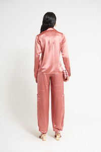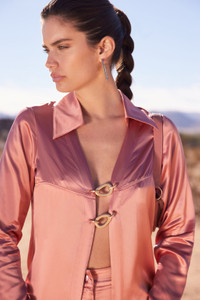 Designed in a luxe Naia satin, the Yoona Top centers around two gold-toned links at the bust, creating an alluringly open central line to the silhouette. The pointed collar leads to a V-neck and the sleek long sleeves end in cuffs. The fabric and openness of this top give this piece elegant movement. Pair with the coordinating Wynn Pant and Alma Earring for a full Gaia look. FIT NOTES Model is 5'7" and is wearing a size Small Center front removable hardware Unlined Buttons at sleeves Easy fit COMPOSTION AND CARE 79% Naia Acetate, 21% Polyester