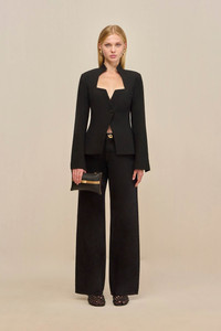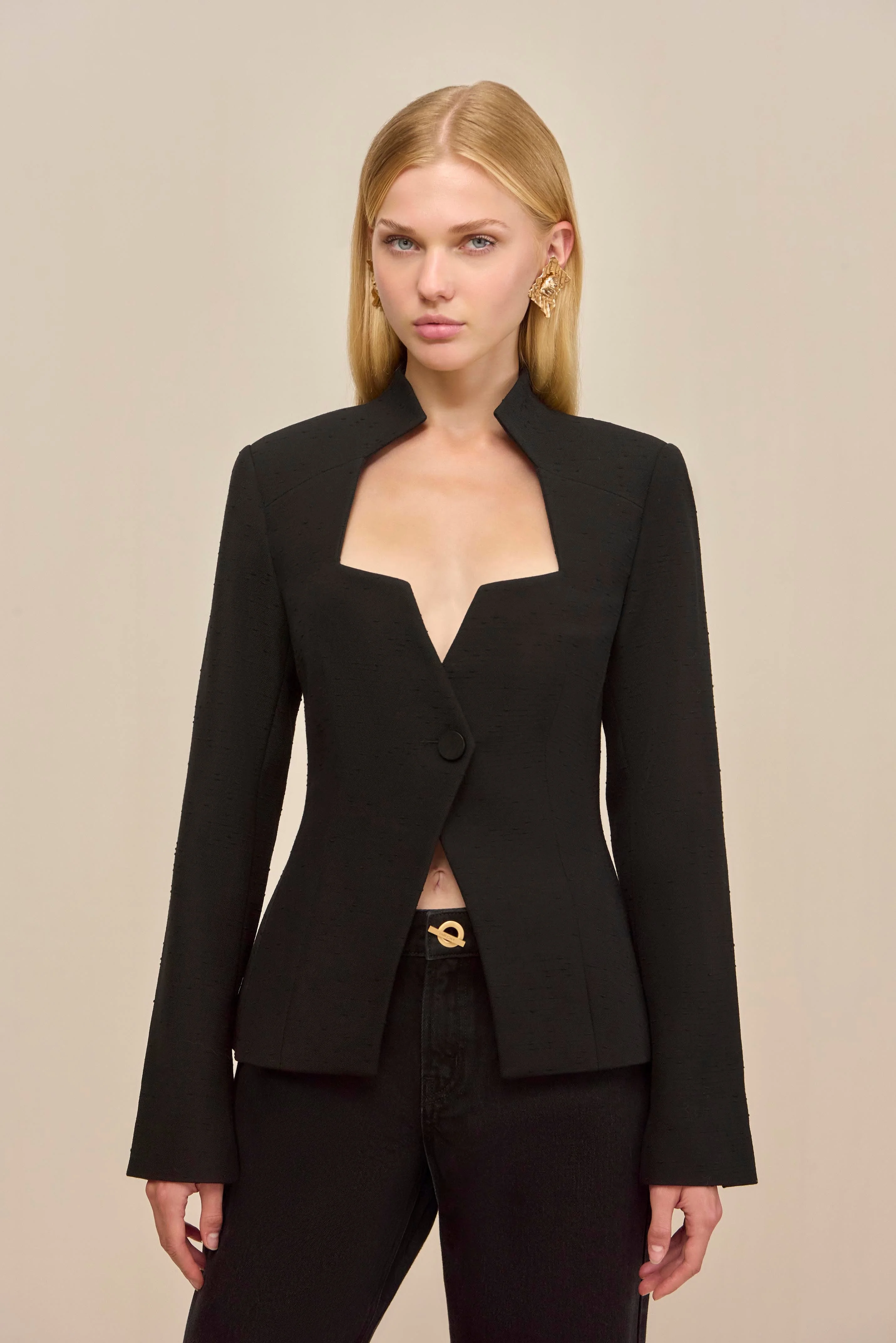 A structured blazer with a unique angled hem and front button closure. — Wool blend — Front button closure — Angled hem — Plunging neckline SIZE & FIT NOTES Model is 5'10" and wearing a size 4 COMPOSITION AND CARE 61% VIRGIN WOOL, 39% POLYAMIDE