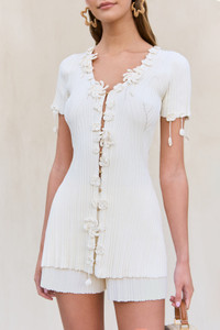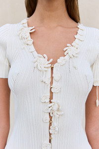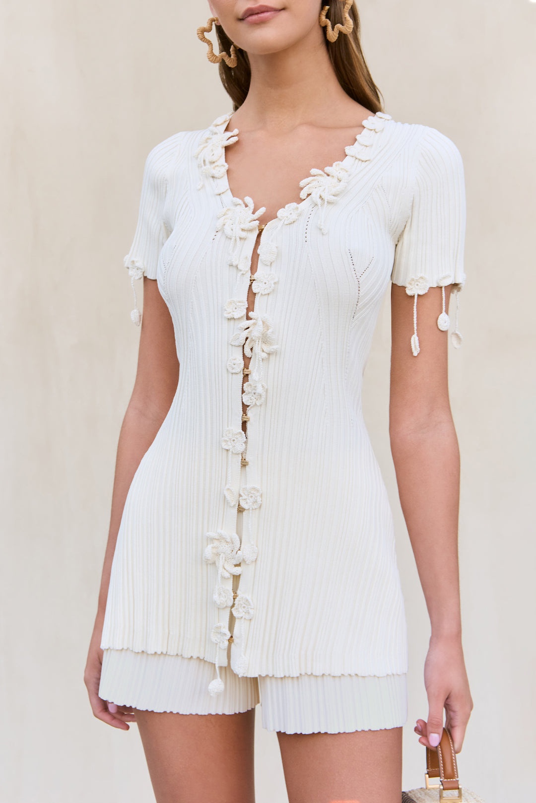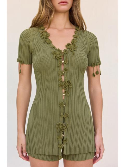 Preorder — Estimated Ship Date Between November 22nd and December 6th A ribbed knit cardigan top with crochet flowers and hook and eye closure. — Full length — Ribbed knit — Crochet flowers — Hook and eye closure — Wear with the Bari Short