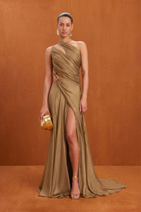 A draped one shoulder silk gown with a front leg slit and gold toned hardware detail at the waist. — Floor length — One shoulder design — Cutout details — Hardware detail at the waist FIT NOTES Model is 5'10" and is wearing a size 4 COMPOSTION AND CARE 100% SILK