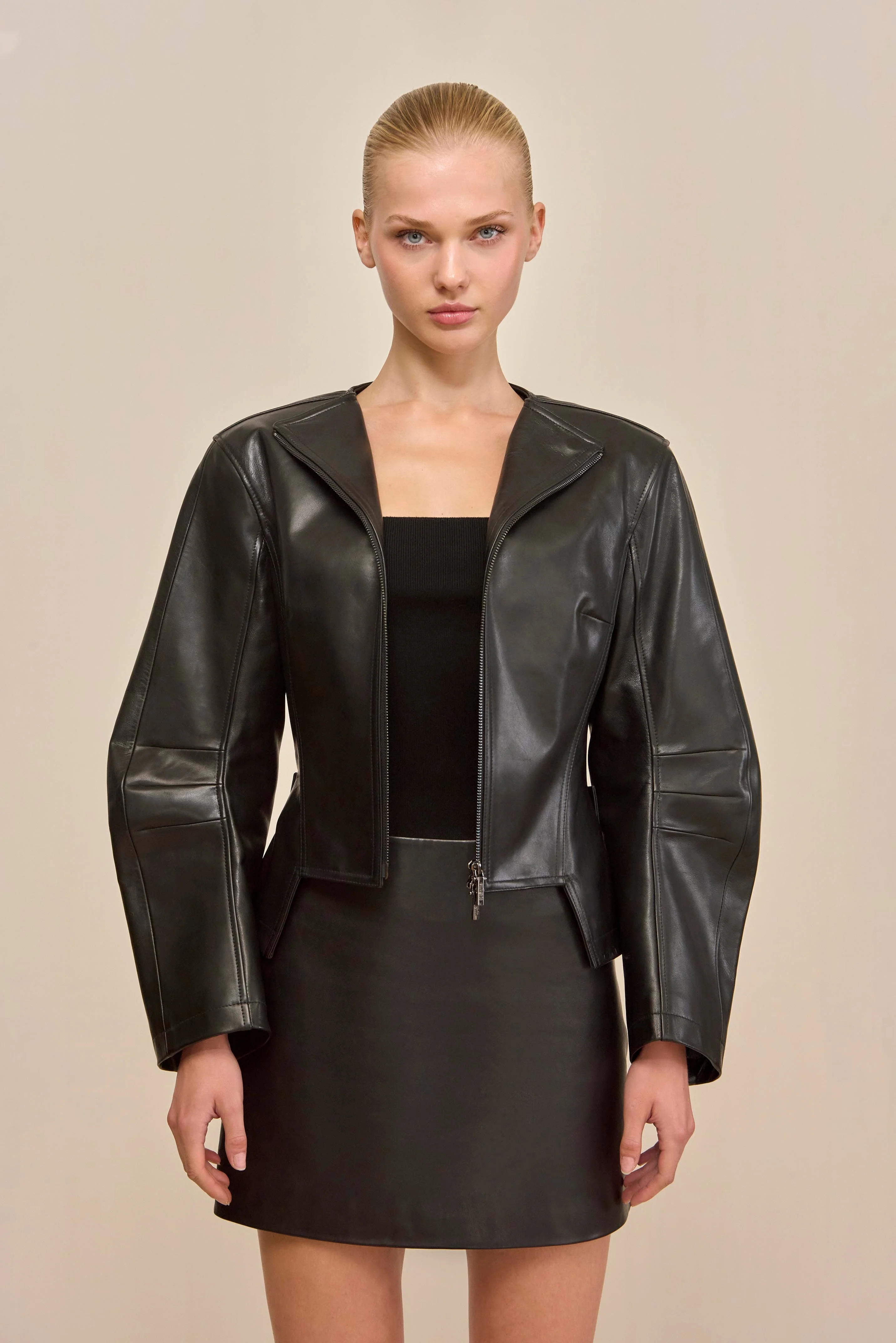 A leather jacket doubling as a sculptural objet d'art, featuring a unique collar designed with two magnets that close to create a mock neck silhouette. — Genuine leather — Mock neck detail — Magnet closure at collar — Exposed front zipper SIZE & FIT NOTES Model is 5'10" and wearing a size Small COMPOSITION AND CARE 100% LAMB LEATHER