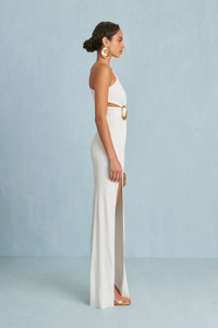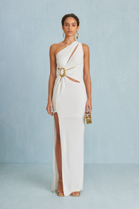 A full length jersey gown with gold toned side hardware and artful cutouts. — Gold toned hardware — Artful cutouts at bust and waist — Asymmetrical one shoulder — Fully lined FIT NOTES Model is 5'10" and is wearing a size Small COMPOSTION AND CARE 100% VISCOSE