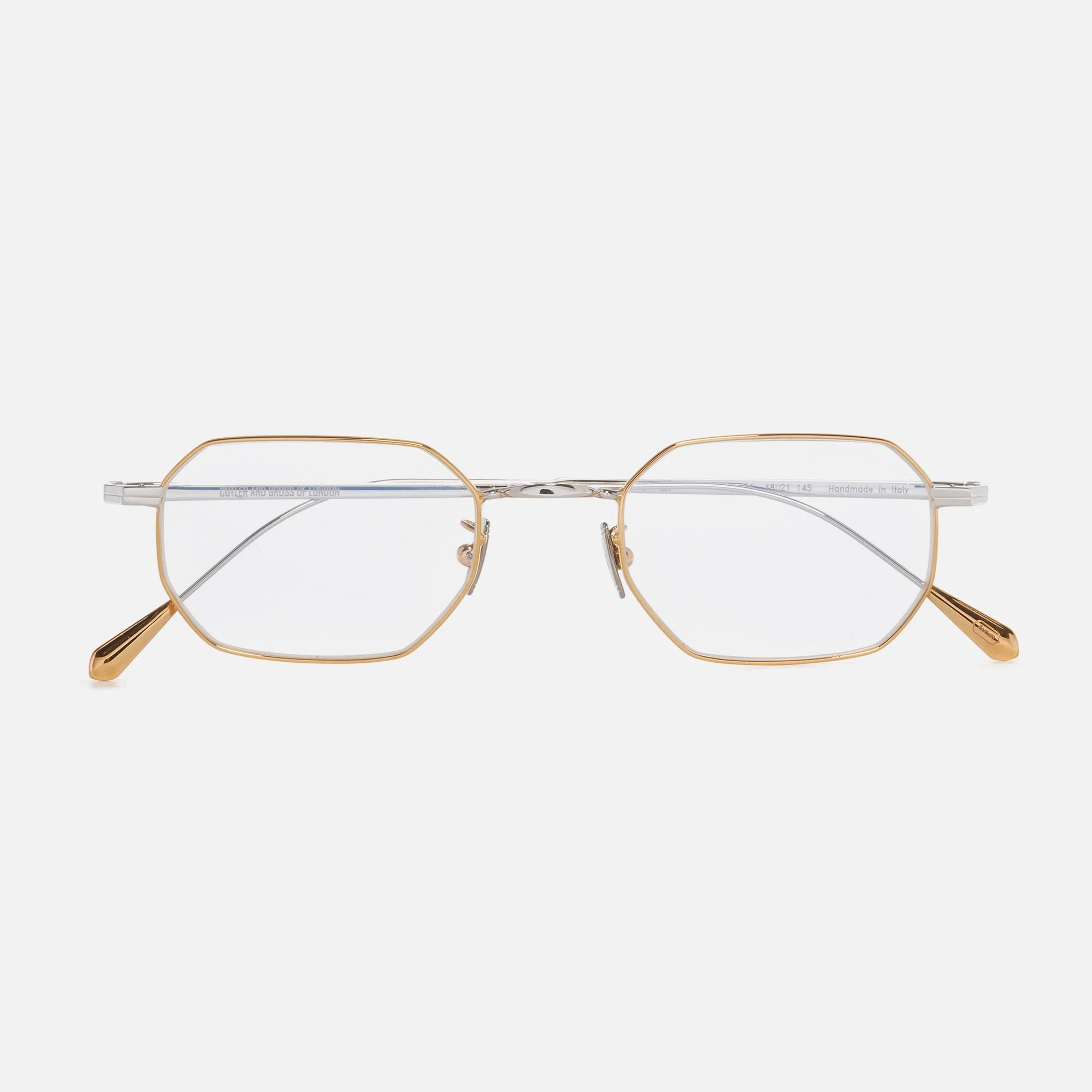 The hexagonal 0005 optical is grounded in our 1990s archive, shaped to a slender profile with a double-curved nose bridge. Rounded corners and high-set lugs lend dimension to the design, which is crafted from ultra-light precious metals. Available in 18K White Gold Rhodium, 18K Gold,18K Rose Gold, and a combination of 24K Yellow Gold and 18K Rhodium. Details - Handcrafted in Italy by expert craftspeople, read more about our craftsmanship story - Double-curved nose bridge - Adjustable nose pads - Engraved logo inside temple - Need help? Read our full Glossary of Terms Size & Fit SKU: AUOP-0005-48-04 Frame shape: Round Lens width (mm): 48 Temple length (mm): 145 Bridge width (mm): 21