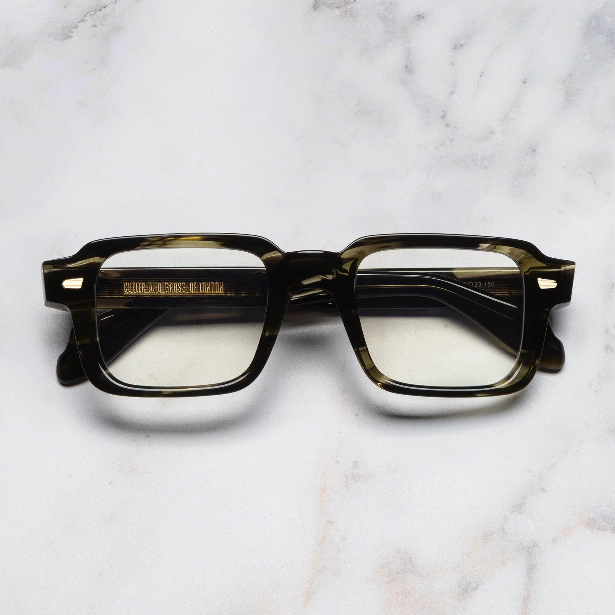The Oyster pin has been a Cutler and Gross motif since 1969 and the legacy continues with the 1393 optical. The defiant square silhouette features milling and straight temple tips for a sculptural finish. Details - Oyster frontal pins - Compass Star temple pins - 5-barrel hinges - Engraved core wire - Gold-foil logo on inner temple - Handcrafted in Italy Size & Fit Frame width: 150 mm Bridge width: 23 mm Temple length: 150 mm Lens width: 50 mm