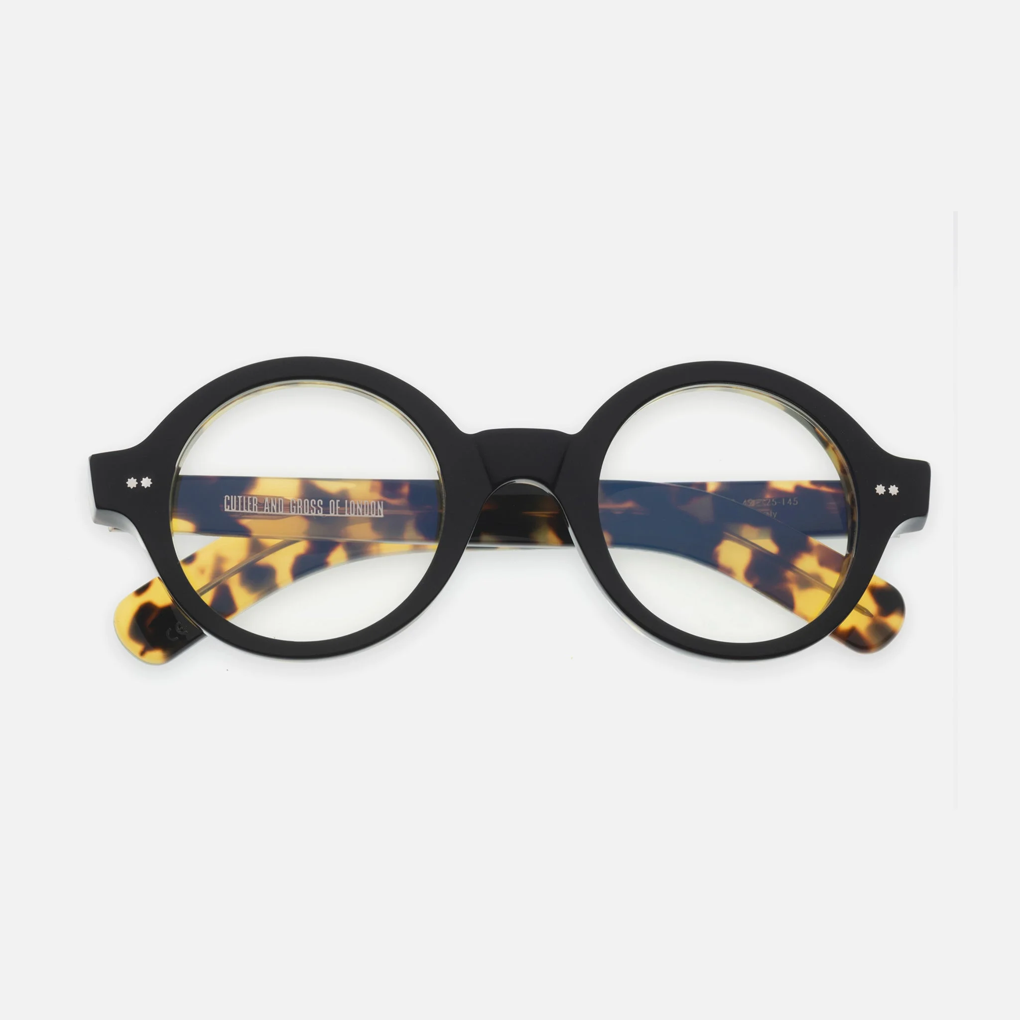 The 1396 invokes the spirit of David Hockney; the seminal post-modernist painter and renowned round-glasses enthusiast. This style is reminiscent of the artists’ favourite Cutler and Gross frame, the now archived 0736. The eccentricity of this frame is translated throughout its design, from the compass eight-point star pins to its perfectly round lenses and striking acetate colourways. Details - Handcrafted in Italy by expert craftspeople, read more about our craftsmanship story - Oyster functional rivets + compass 8 points star functional rivets - Fretboard core wire - CG Fender temple shape - Akulon lined screws with 5 barrel hinges hardware - Signature Gold Foil Logo inside right temple - Need help? Read our full Glossary of Terms Size & Fit SKU: CGOP-1396-49-02 Frame shape: Round Lens width (mm): 49 Temple length (mm): 145 Bridge width (mm): 25