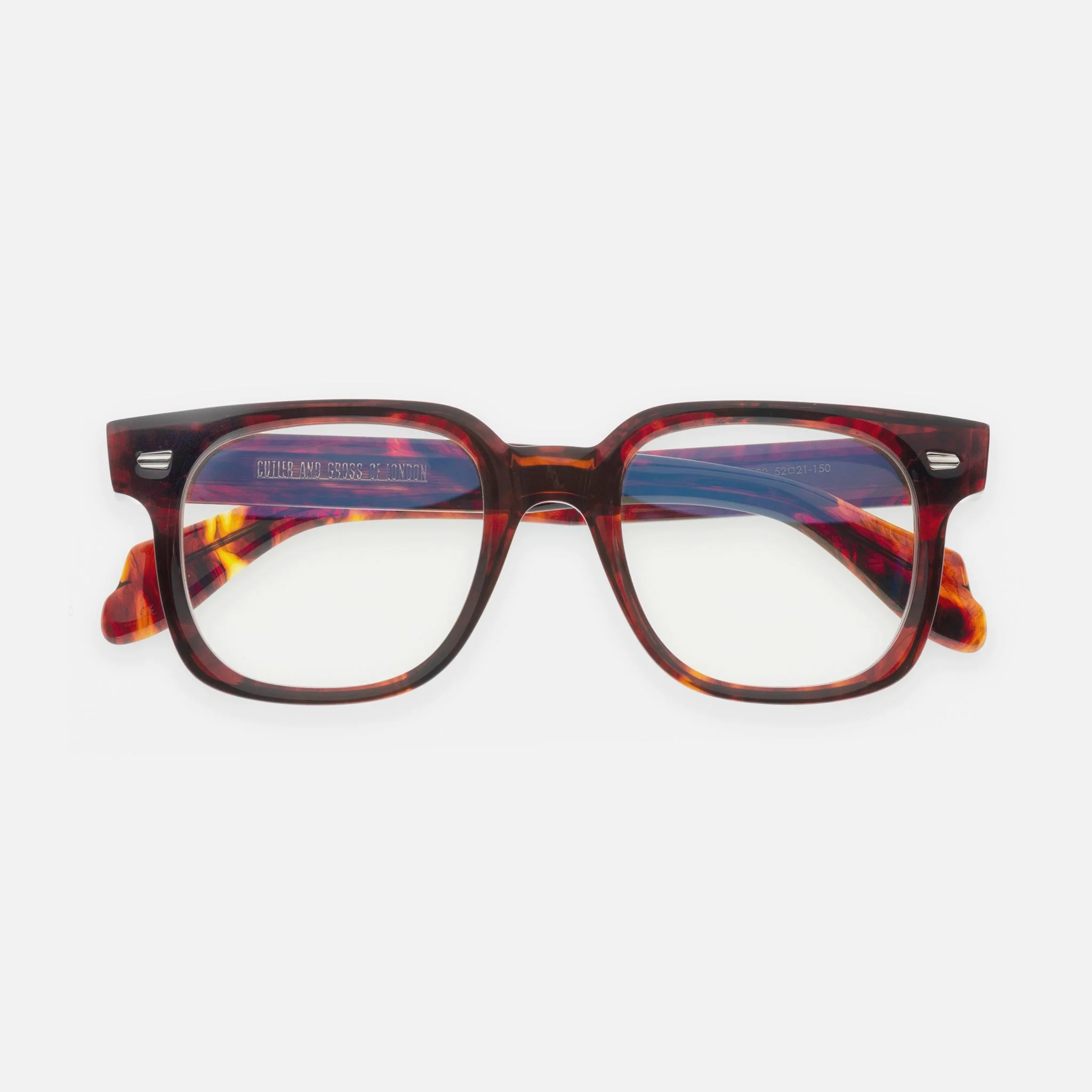 Cutler and Gross's storied Oyster pin decorates the front of this optical. It is set with a high hinge and threaded with engraved core wire. Details - Oyster frontal pins - Compass Star temple pins - 5-barrel hinges - Fretboard core wire - Gold-foil logo on inner temple - Fender temples - Handcrafted in Italy Size & Fit Frame width: 150 mm Bridge width: 21 mm Temple length: 150 mm Lens width: 52 mm